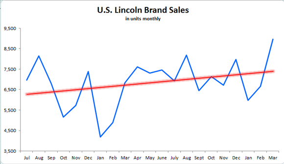Behind Lincoln's strengthening sales is the recent redesign of the MKZ sedan, sales of which were up 72% in March compared to the same time last year, but the comparison is a bit skewed due to a lack of inventory last year. Sales of the new MKZ have helped send Lincoln brand sales surging 31% in March, 36% for the first quarter, and 27% over the last six months.