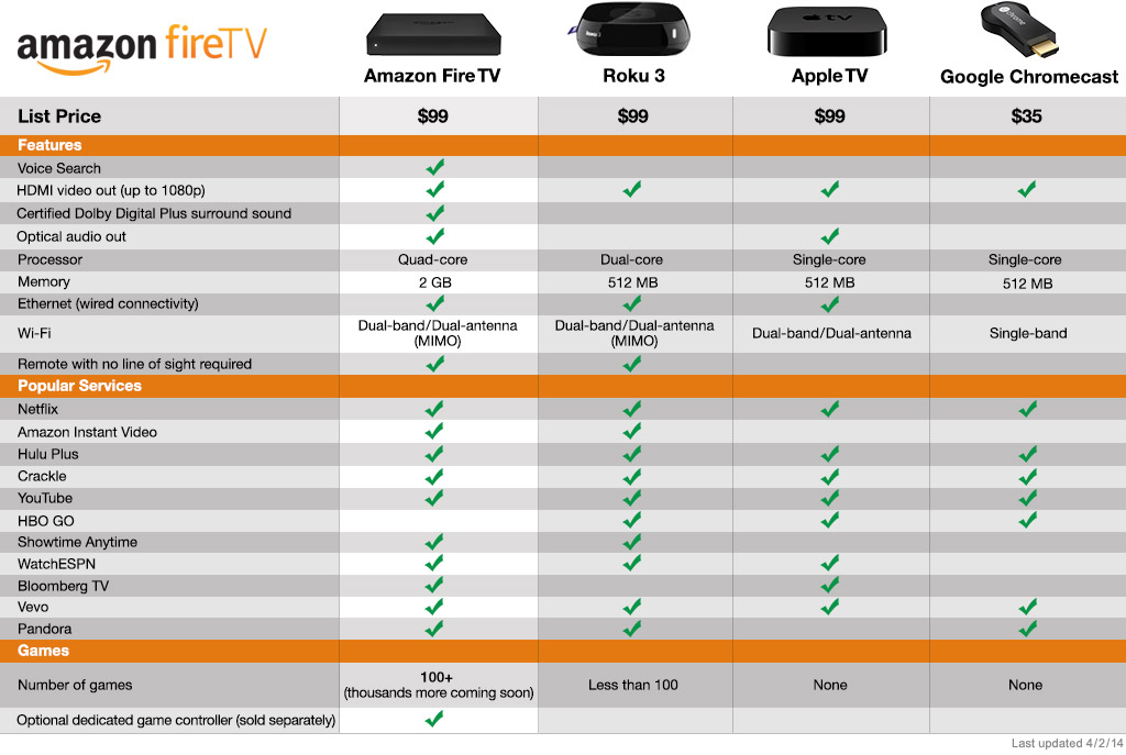 Based on its price and features alone, Fire TV clearly outclasses its three closest competitors -- the Apple TV, the Roku 3, and the Chromecast -- by a wide margin: