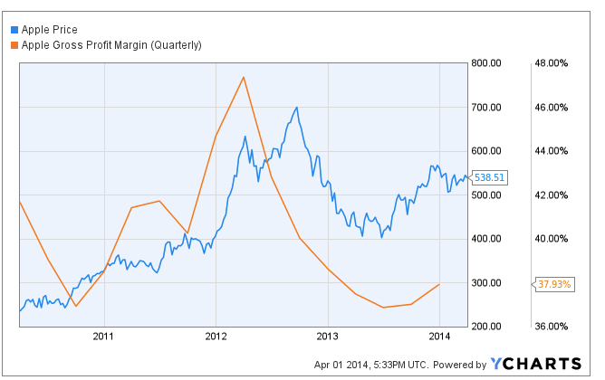 Facing increasing demand for smaller tablets, Apple launched the iPad Mini in February 2012. According to NPD Research, Apple expected the iPad Mini would account for 40% of total iPad sales. However, the Mini proved to be far more successful than Apple anticipated; Gartner estimated that the Mini accounted for 60% of iPad unit sales in the first quarter of 2013.Unfortunately for Apple, the iPad Mini's margins were significantly lower than the rest of the company's products, putting higher-than-expected pressure on the company's margins.The graph below shows the dramatic impact of the iPad Mini on Apple's margins and stock price.