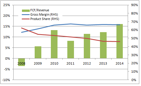 Product share of revenue has declined as services revenue and free-cash flow conversion have increased; software and service-based businesses tend to generate more free-cash flow. The one disappointing aspect is that operating margins are forecast to be flat this year.