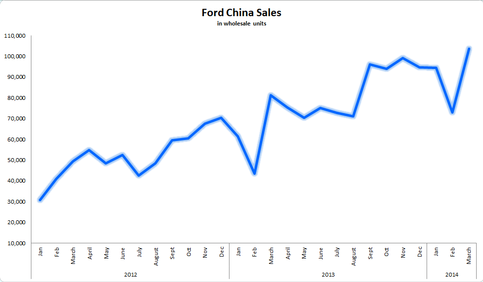 Ford sold 103,815 wholesale vehicles last month in China, which was the first time the Dearborn automaker's results topped 100,000 sales in a single month. Its March performance was a strong 28% improvement over that of March 2013; it capped off an excellent first quarter that saw sales surge 45% over last year's corresponding period.