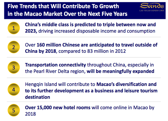 Las Vegas Sands (LVS +3.86%) executives have pointed to five trends that will lead to continued growth in Macau over the next five years. Diving into the second trend on the list, the growing number of Chinese citizens that now have the ability to travel outside of the Chinese mainland is driving growth in Macau and driving profits for gaming companies like Las Vegas Sands, MGM International (MGM 0.05%), Wynn Resorts (WYNN +4.95%), and Melco Crown (MPEL +0.30%). While only 83 million Chinese traveled outside of the mainland in 2012, the number could nearly double in the six years from 2012 to 2018, according to estimates.