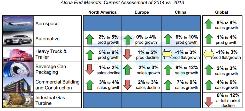 2014 is expected to be a strong year for aluminum demand. Alcoa's management expects global aluminum demand growth of 7% and is projecting a deficit of 730,000 tons in 2014. Among the company's end markets, aerospace is expected to register the strongest growth, with Alcoa increasing its 2014 growth estimates to 8-9% from 7-8% previously. Robust demand for both large commercial aircraft and regional jets and continued growth in the business jet market is driving strong aluminum demand in the aerospace sector.