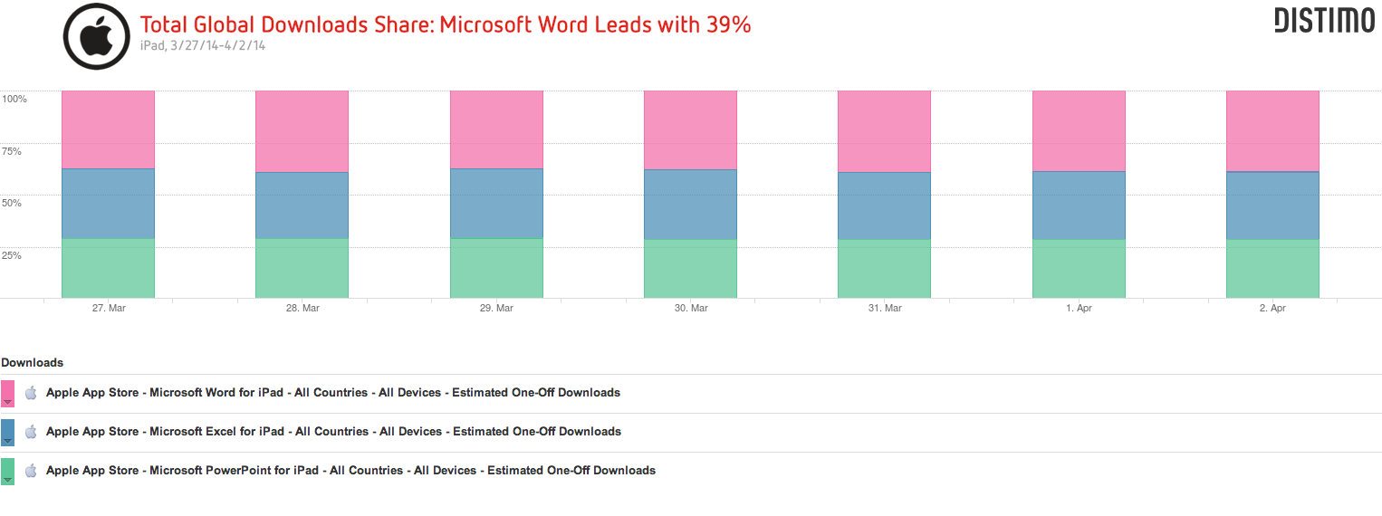 Analytics firm Distimo ran some numbers to determine which of Microsoft's iPad apps has monetized the best in these first two weeks. The first part of the puzzle came from looking at how many free downloads each program received, as this can serve as a sort of baseline for the popularity of each product when cost isn't a factor.