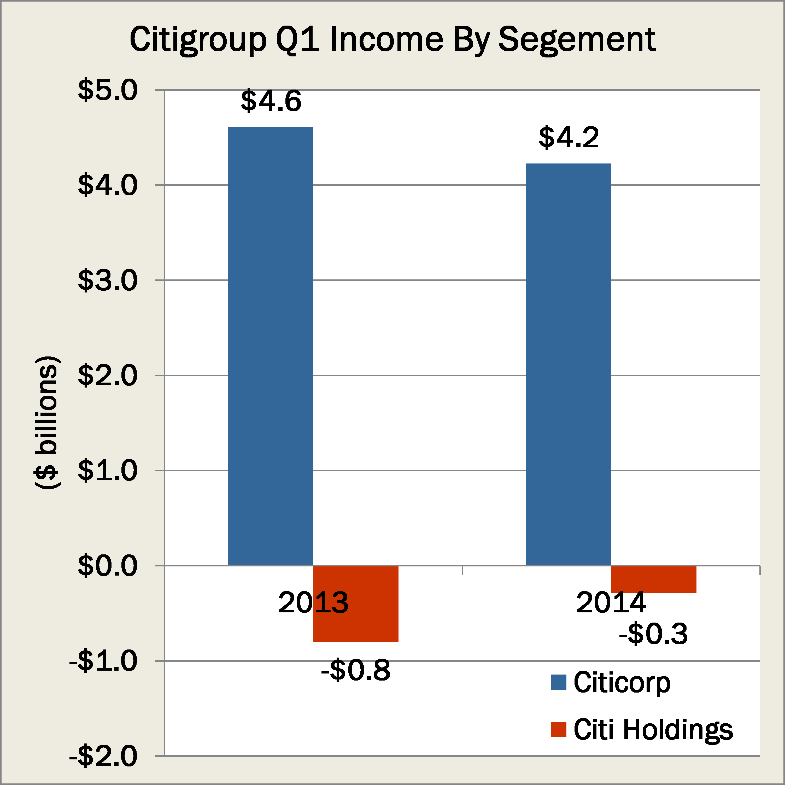Citigroup separates its earnings into two segments, Citicorp and Citi Holdings. Citicorp consists of its core operations, whereas Citi Holdings are its noncore businesses it is seeking to wind down in both a quick and rational way. As a result, a consideration of Citigroup should almost always observe the performance of Citicorp, and it is there where trouble has originated.