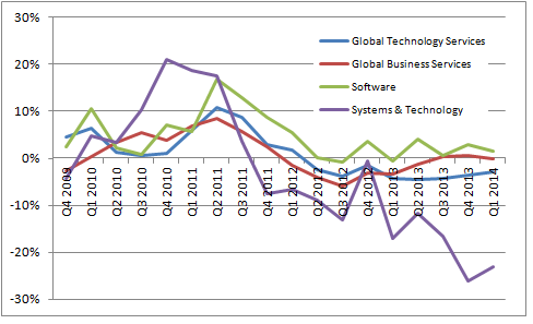 Furthermore, the headline trends in IBM's businesses appear to be moving in the wrong direction. A cursory look at the revenue growth rates within its trading segments reveals some tough trading conditions.
