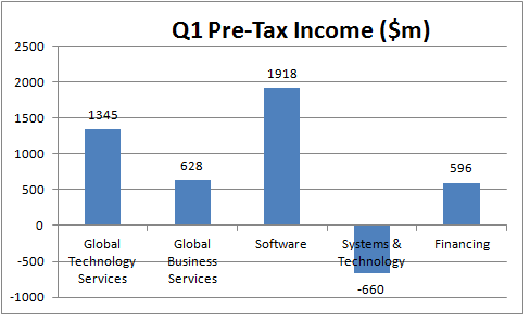 The first is that IBM strongest growth –albeit a paltry 1.6% in the quarter—is coming from its most profitable segment (Software), while its weakest segment (Systems and Technology) is seeing the worst declines. A look at first quarter segmental income demonstrates the point: