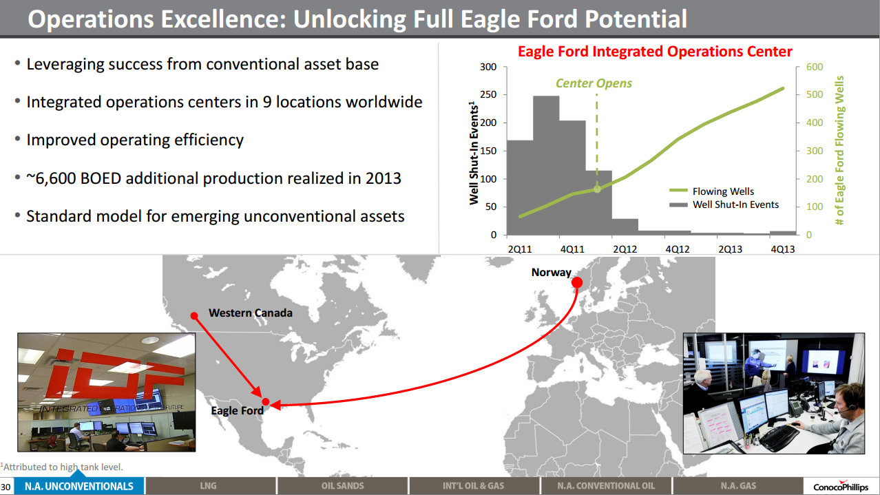 Another innovation by ConocoPhillips is its integrated operations centers. The company has nine of these centers across the world, including a new one in the Eagle Ford Shale. These centers use real-time data, which alerts the company of trouble before it knocks a well offline and thus these centers work to reduce production shut-ins. These have been highly successful in the Eagle Ford as the chart in the right-hand corner of the following slide shows.