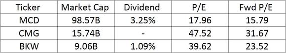Looking at ratios like P/E, forward P/E, and dividend yield, McDonald's trades at a big discount versus competitors such as Chipotle Mexican Grill and Burger King.