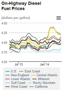 While gas prices increased, diesel also prices edged higher, up $0.004 over the past week to $3.975 per gallon. This latest price tag puts diesel $0.124 per gallon above the same time last year. The West Coast also saw the biggest diesel price increase this past week ($0.025), while East Coast prices managed to dip $0.005.