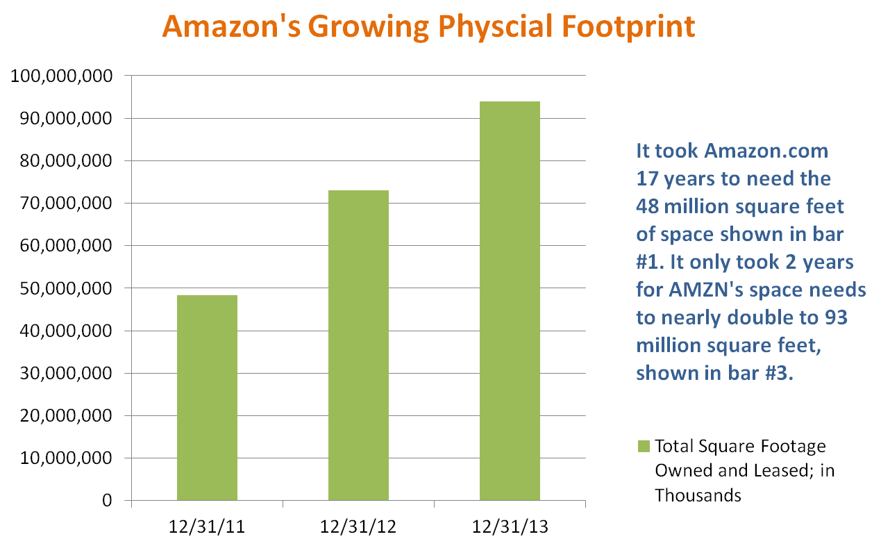 The coming cash commitment is easier to understand through the lens of total square footage that the company owns and leases, including its offices, data centers, and global fulfillment facilities. This is a major driver of Amazon's obligations. At the end of 2011, the company owned or leased 48 million square feet in these three categories. Only 24 months later, the company had more than 93 million square feet either owned or under lease: