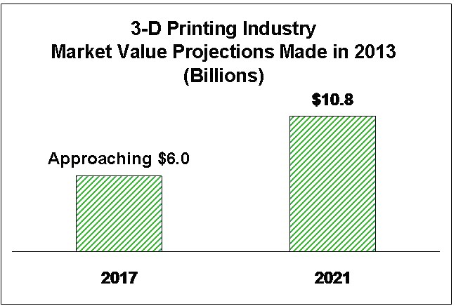 The global 3-D printing industry grew 34.9% in 2013, which is the highest annual growth rate in 17 years. Over the last 26 years -- which is essentially the life of the industry -- revenue has grown an average of 27% annually, while the compounded annual growth rate for the past three years (2011-2013) was 32.3%.