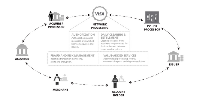 Although the swipe of a card is simple and easy, the payments industry encompasses a variety of moving parts, pieces, firms and industries. A quick glance at a chart from Visa in its latest annual report shows just how complex it is: