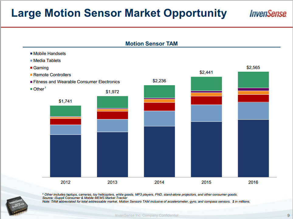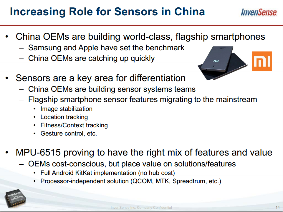 Taking a long-term view, it's important to understand that while the high-end smartphone market is maturing, there is a very long runway for the mass-market smartphones to "grow up" in performance, features, and capabilities. This means that most smartphones, from cheap $149 off-contract devices to premium devices like the Samsung Galaxy S5 that InvenSense is currently in today, will require increasingly sophisticated motion sensing to fully take advantage of next-generation smartphone usage models.