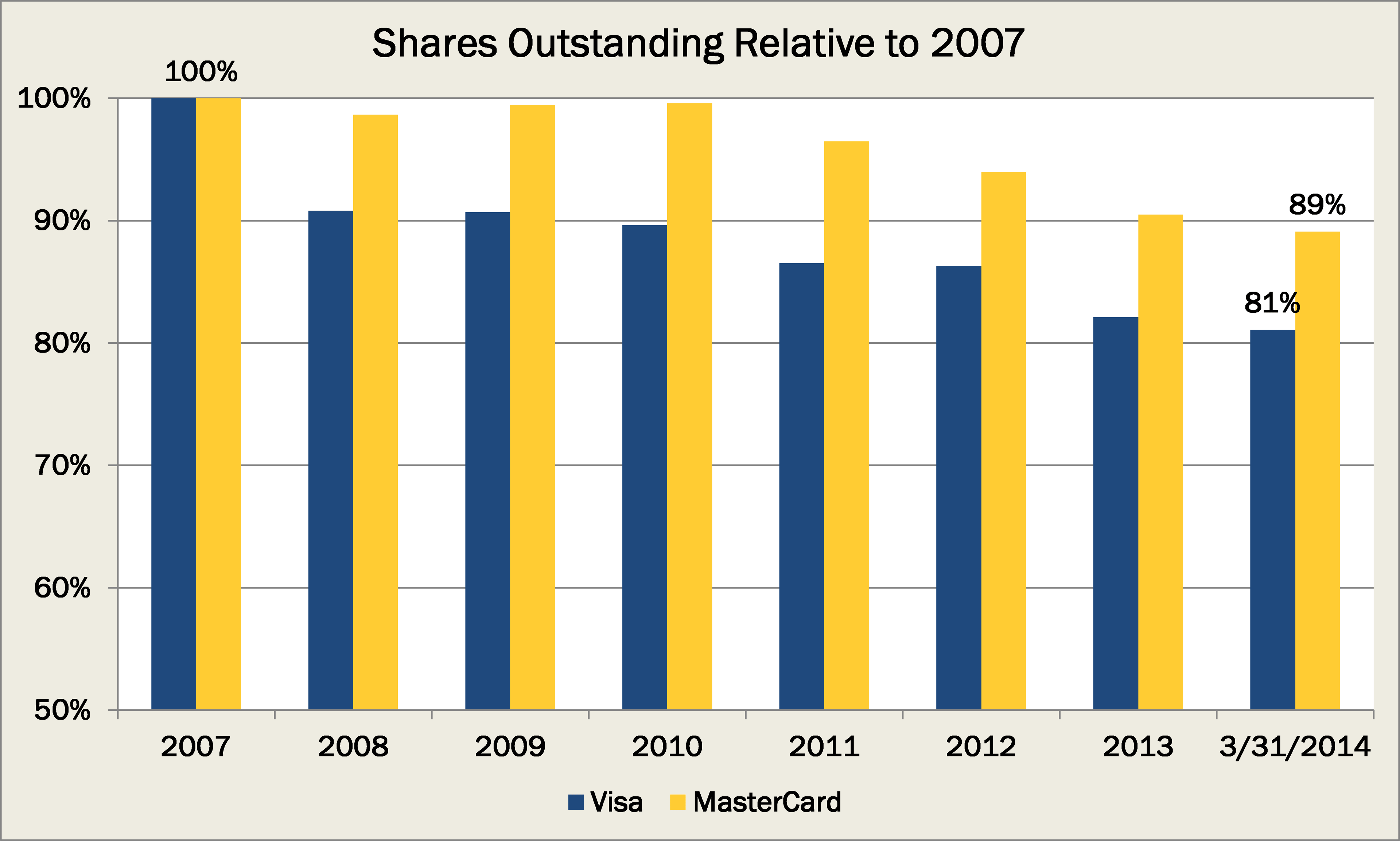 But it wasn't just the first three months of 2014 that marked times when the companies were aggressively buying back their stock. As shown in the chart below, Visa has watched its total common shares outstanding fall by nearly 20% since 2007: