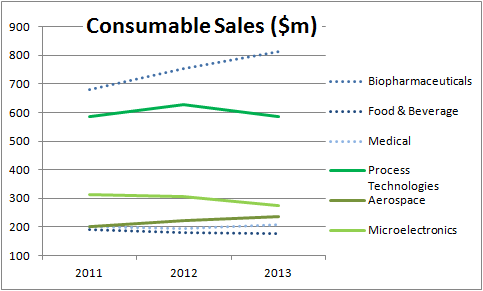 Fast-forward to Pall's latest third-quarter results, and a familiar refrain is being played out, with life science consumable sales growing 9.9% at constant currency and industrial consumable sales only growing 1%.