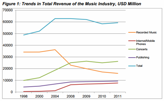 Considering the years in which online piracy became popular, there's even evidence to suggest the illegal downloads gave the music industry a boost. Some of the confusion comes from the drastic decline of CD and vinyl sales, which was predicted independently of piracy due to the crushing wheel of progress, in this case digital recordings. But the increase in online sales and concerts more than makes up the loss.