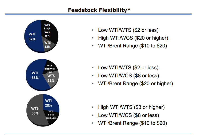 Along with WTI, the advantage crudes the company uses are Western Canadian Select, which currently trades at a discount of $20 to Brent, and West Texas Sour, which trades at a discount of around $10.