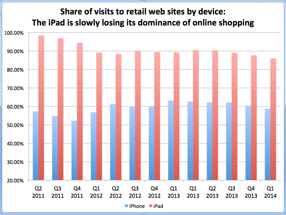 According to recent data from Monetate, Apple is slowly losing share of online shopping. The iPad now accounts for a "mere" 86% of tablet shoppers, and the iPhone accounts for 58% of smartphone shoppers.