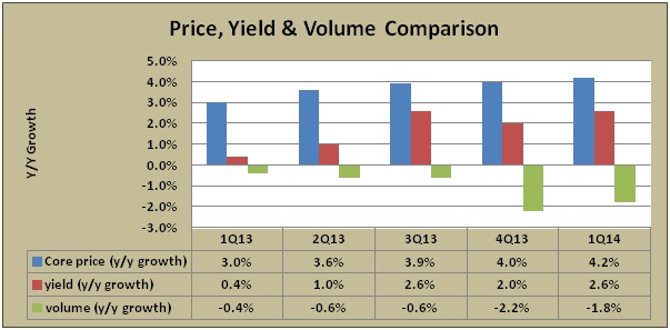 This was visible in the first quarter where lower volumes affected revenue by 1.8%, but a 100 basis point increase in core prices gave the company a necessary boost in the yield, which had a 2.6% positive impact on revenue. Total revenue increased 1.8% to $3.4 billion.