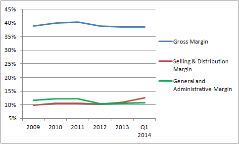 However, the good news is that management expects gross margins to improve. CEO Selim Bassoul said on the most recent conference call, "Once this transition of inventory on the channel is complete, we anticipate the gross margin rate will revert to levels higher than in the second half of 2013."