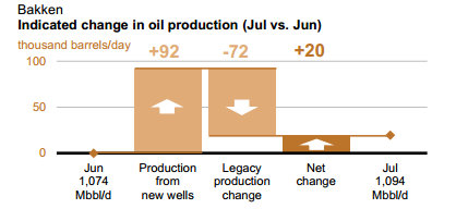 As the slide portrays, the EIA sees new wells drilled this month adding 92,000 barrels of oil per day to the Bakken's production stream. But declining production from legacy wells drilled over the past few years will take a big bite out of this growth. According to the EIA these wells will lose 72,000 barrels of oil production per day. The net result is that oil production out of the Bakken Shale will only be up 20,000 barrels per day.