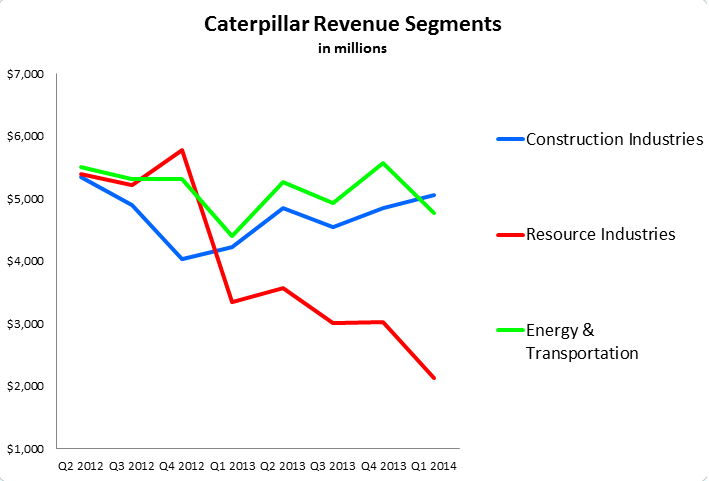 Looking at Caterpillar's top and bottom lines over the last eight quarters will offer a better grasp to what extent plunging sales in the company's resource industries segment have affected its business.