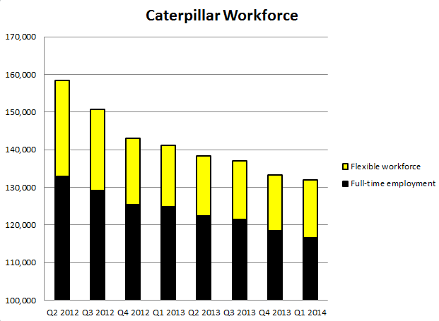 Caterpillar's workforce has steadily been cut. Source: Caterpillar's annual reports.