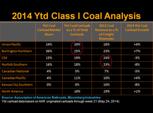 The third column demonstrates that CSX and Norfolk Southern have a 23% and 24% exposure to coal within their respective freight revenues. Interestingly, Union Pacific has only 18%, suggesting that Union Pacific is the "go-to" stock if you are worried about future coal demand.