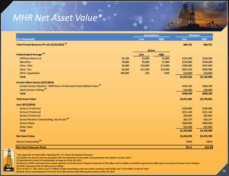 As noted on the above slide, most of Magnum Hunter Resources' value is tied up in the company's undeveloped acreage position, which Magnum Hunter Resources sees being valued between $1.6-$2.1 billion. Needless to say, that undeveloped acreage is quite the land bank that could be sold off if a liquidity crisis ever hit. Selling off undeveloped acreage had become the basic blueprint followed by nearly every major shale driller as it was the plan that was pioneered by Chesapeake Energy. On top of that the company's interest in its midstream subsidiary is worth between $438-$608 million, which again could be monetized if debt repayment became an issue as that's what Chesapeake Energy chose to do with its midstream business a few years ago. So, while Magnum Hunter Resources does have a lot of debt, it also has more than enough assets to maintain its debt.