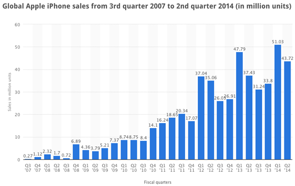 This chart from Statista shows how, during the past few years, the fiscal first quarter brings in the most sales for Apple's iPhone.