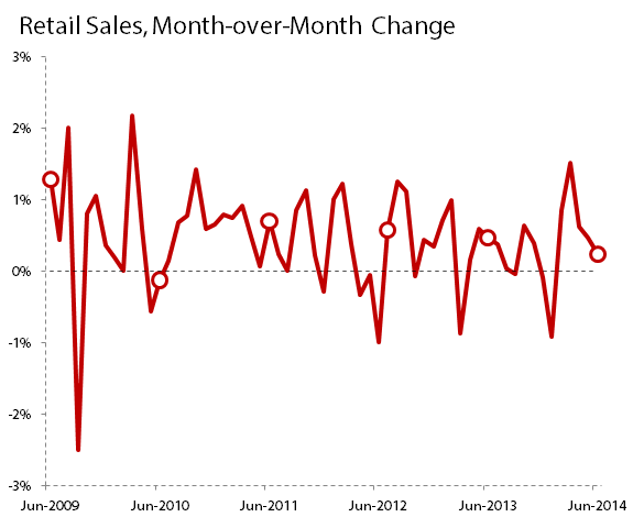 Retail sales were hindered by one of the weakest months for auto sales since the recession ended in 2009. "Core" retail, which excludes the impact of auto sales (including parts) and gas-station purchases, actually grew by 0.4%. Auto-related purchases were the largest overall drag on the retail sector, with a 0.3% month-over-month decline trailed in nominal dollar terms only by a full percentage-point drop in home-improvement store sales. June's month-over-month drop wasn't the worst this sector has experienced lately, and when we look at auto sales on a year-over-year basis, it looks more reasonable -- a small dip in what's otherwise been the most consistently strong retail sector in the American economy since the recession ended: