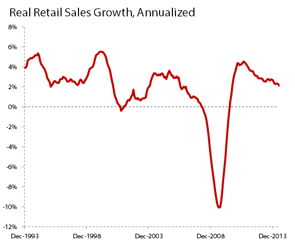 On the other hand, pessimists can still point to the slow but unmistakable fall in real retail sales growth as evidence that the current economic expansion is nearer its end than its beginning. On an annualized basis and after adjusting for inflation (the Commerce Department uses nominal dollar figures and does not adjust for inflation), this month's growth is the lowest yet since it peaked shortly after the recession ended. As you can see on a longer timeline, this sort of gradual drop can (but need not) signify an oncoming economic slowdown -- it closely resembles the post-dot-com slide, but does not much resemble the generally stable retail-sales growth rates enjoyed for much of the mid-1990s: