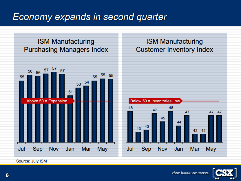 Going forward, as the U.S. economy gains more momentum, it will provide CSX with a surge in business. Consider that ISM Manufacturing's Purchasing Managers Index has continually indicated expansion in the U.S. manufacturing industry during the last year. Moreover, ISM Manufacturing's Customer Inventory Index has continued to indicate inventories remain low -- a potential boost in business for CSX when those inventory levels inevitably rise.