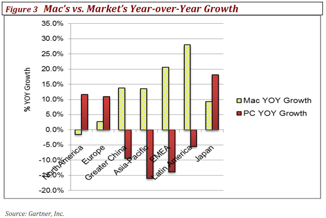 According to recent Gartner data, Apple's Macs are significantly outpacing PC growth in Greater China, the Asia-Pacific region, Latin America, and the EMEA region -- Europe, the Middle East, and Africa.