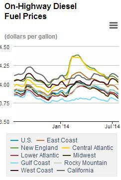 Diesel prices followed gasoline's lead with a $0.025 dip over the past week to $3.869 per gallon. This latest price tag puts diesel $0.034 per gallon below its price the same time last year. East Coast prices fell the most ($0.033), while Rocky Mountain residents missed out again with a relatively minor $0.007 decline.