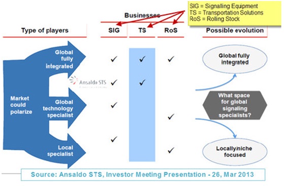 Ansaldo's management believes that the rail equipment industry is ready to take up another consolidation cycle and will gradually evolve. The future of the industry lies in providing turnkey rail-transit solutions, and companies will have to evolve into fully integrated organizations to accommodate this in the days to come. This will actually be a big change for present-day rail equipment makers that specialize in either signaling or rolling stock. In such a situation, Alstom's management will have the freedom to chase further consolidation options.