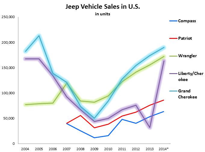 *2014 is projected from sales through July; 2013 Liberty/Cherokee sales are combined during model transition. Source: FCA sales releases.