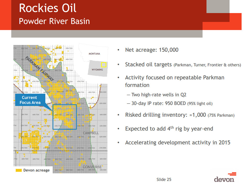 The final area that could fuel a rising stock price at Devon Energy is its emerging oil plays in the Rockies and Mississippian-Woodford. Of the two, the most compelling one to watch is the Rockies oil play. As the following slide notes, this play has stacked oil targets that are delivering strong initial returns.