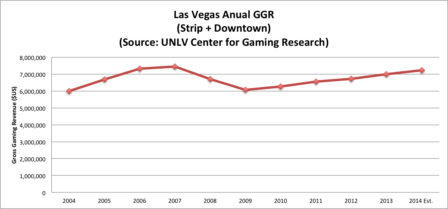 Las Vegas' total gaming revenues, following years of steady growth, were suddenly marred by the 2008 financial crisis. Now, the gaming economy in the city has slowly started to pick up and is getting close to reaching 2007 highs. According to the Center for Gaming Research at the University of Nevada, Las Vegas, the Las Vegas Strip is performing better than the rest of the state during the first half of 2014, with revenues up 3.4% over the same period in the year prior, but with extreme monthly variations. Las Vegas' downtown is not performing as well at 1.8% growth YOY, but that is still an improvement.