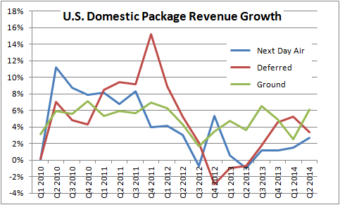 Clearly, ground-based revenues have grown more quickly in the last couple of years than the other components of the U.S. domestic package segment. For ease of reference, ground made up 43.5% of total company revenue in the second quarter, while next-day and deferred contributed 11.5% and 5.8%, respectively.