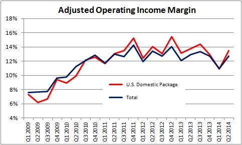 Moreover, ground revenues generate significantly lower revenue per package. For example, in its last quarter,the next-day delivery segment reported revenue per package of $20.73, with deferred coming in at $9.73 and ground at $8.03. In addition, the last two years have seen a decline in place for the ground segment. For example, revenue per package in the ground sub-segment was $8.08 in the second quarter of 2012, then declined to $8.03 in the comparable quarters for 2013 and 2014. A difference of $0.05 may not seem much, but remember that it's an absolute 0.6% decline in two years when inflation has been rising at 2% to 3% in the economy.