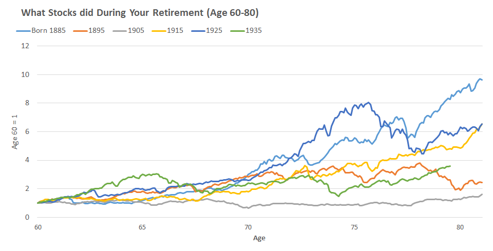You can imagine someone born in 1885 talking about the glorious, glorious benefits of owning stocks during retirement. Or someone born in 1905 wishing they had stuck to bonds, which earned a higher return with less volatility during their own retirement.