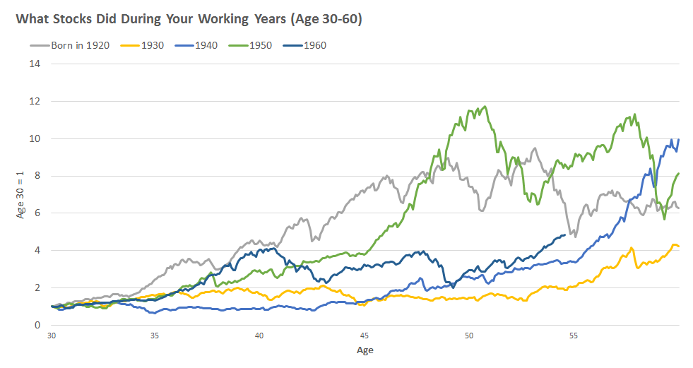 From age 30 to 50, those born in 1930 got no return out of stocks. Those born in 1950 saw stocks rise twelvefold. These are not small differences. They implanted a completely different view on what markets are capable of.