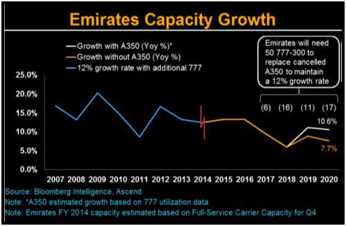 Slated to be A350-XWB's launch customer, Emirates had placed orders for 70 units in 2007 with deliveries to begin in 2019. Bloomberg thinks this delivery schedule could have influenced the airlines' decision to cancel the order. Timely fleet expansion is critical to future prospects of all Gulf airline operators because Dubai, Doha, and Abu Dhabi are emerging as the most popular stopovers for passengers flying between Europe and Asia. Emirates has ensured a fleet growth rate of 15.5% to date since 2007. Deliveries of A350s starting in 2019 would mean Emirates' fleet expansion rate would have dropped to 10% or below in the 2017-18 period.