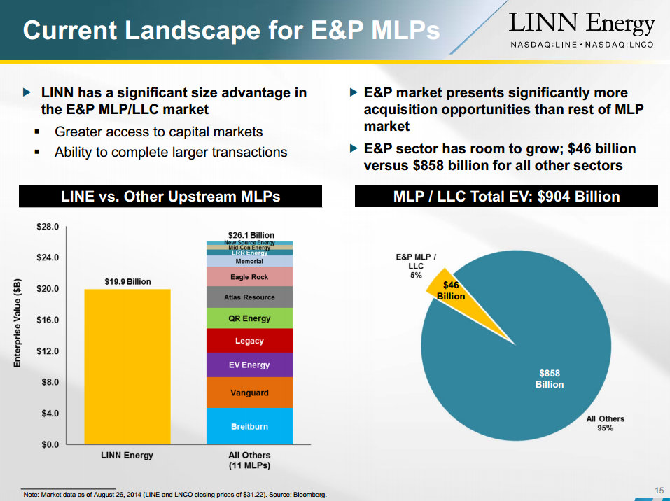 Owning a big chunk of LINN Energy is a big advantage because LINN Energy is by far the largest upstream MLP in the sector, as the following slide shows.
