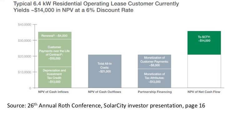 First, as this slide indicates, the typical solar city installation costs $21,000, 62% of which is covered by tax credits, which the company obtains from outside partners such as Google and US Bancorp through tax equity funds. Unfortunately, the tax credit is set to expire by the end of 2016, and should it not be renewed, that would greatly slow the company's plan to grow to 1 million customers by mid-2018 (they currently have 140,000).