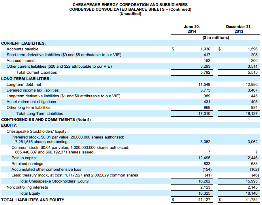 What stands out here is the big reduction in long-term debt, as it's down by over $1.3 billion in just six months. We know that a big chunk of that debt went with Seventy Seven Energy, but part of the purpose of that spinoff was to reduce debt at Chesapeake Energy, so that's not a surprise.