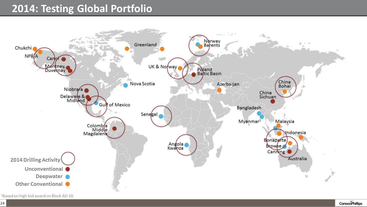 As the above slide notes, ConocoPhillips is investing in deepwater exploration projects in the Gulf of Mexico, Angola, and Norway this year. On top of that it's also looking for oil and gas through conventional means in Alaska, the North Sea, and in Asia. Finally, it's exploring for unconventional resources in North America, Poland, Australia, and Colombia. By diversifying its exploration efforts ConocoPhillips not only is reducing its risk, but should be able to discover a balanced mix of opportunities that will fuel its growth over the next decade.