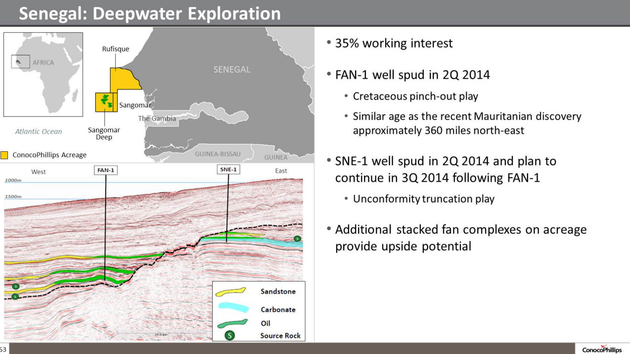 While North American shale production is driving most of ConocoPhillips' (COP +3.06%) growth these days, the company isn't just relying on shale to fuel its future. Instead, the company is exploring for oil around the world so that it can fuel its growth once shale production slows down. One of the places it's looking for oil is Senegal, which isn't yet known as an oil hub. That could change as the company and its partners have announced a deepwater discovery 60 miles offshore.